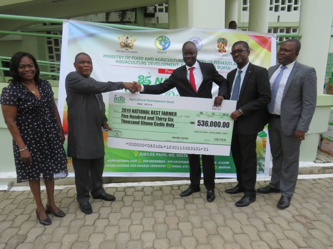The bank presented a sponsorship cheque for five hundred and thirty six thousand Ghana cedis (GHS536,000.00), the cedi equivalent of (US$100,000.00) one hundred thousand US dollars to the Minister of State at the Ministry of Food and Agriculture & Chairman of the Planning Committee, Hon. Dr. Gyiele Nurah as the prize for the 2019 National Best farmer.