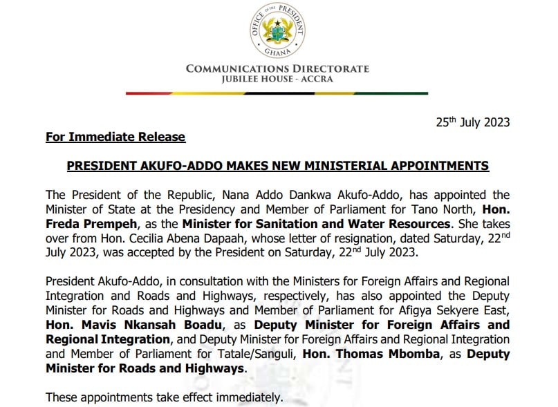 She replaces Hon. Cecilia Abena Dapaah whose letter of resignation, dated Saturday, 22nd July 2023, was accepted by the President on Saturday, 22nd July 2023.