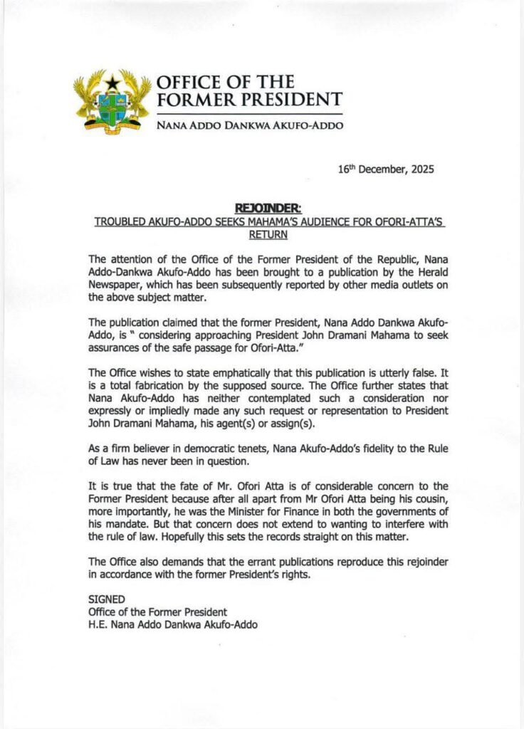 The publication suggested that Akufo-Addo was considering approaching President Mahama to intervene on Ofori-Atta’s behalf—a claim the former President’s office emphatically denies.