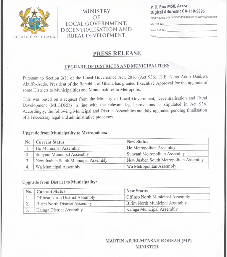 The Ministry of Local Government, Decentralization, and Rural Development (MLGDRD) issued a statement confirming the upgrades, stating, “”Pursuant to Section 3(1) of the Local Governance Act, 2016 (Act 936), H.E. Nana Addo Dankwa Akuffo-Addo, President of the Republic of Ghana has granted Executive Approval for the upgrade of some Districts to Municipalities and Municipalities to Metropolis. This was based on a request from the Ministry of Local Government, Decentralisation and Rural Development (MLGDRD) in line with the relevant legal provisions as stipulated in Act 936. Accordingly, the following Municipal and District Assemblies are duly upgraded pending finalisation of all necessary legal and administrative processes.”