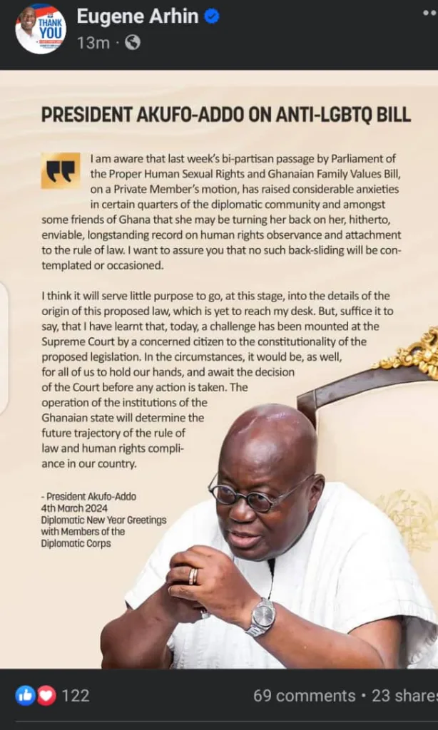 President Akufo-Addo has stated that assenting to the anti-LGBTQ+ bill will await a pending case at the Supreme Court.