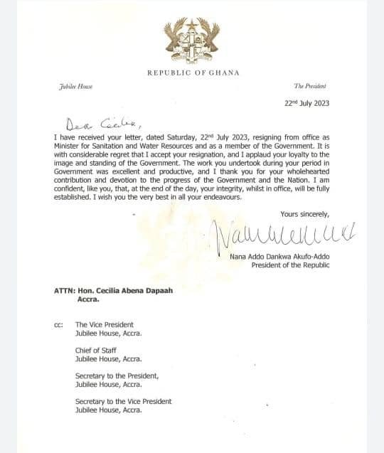 “The President of the Republic, Nana Addo Dankwa Akufo-Addo, has accepted the resignation from office of Hon. Cecilia Abena Dapaah as Minister for Sanitation and Water Resources and member of Government.