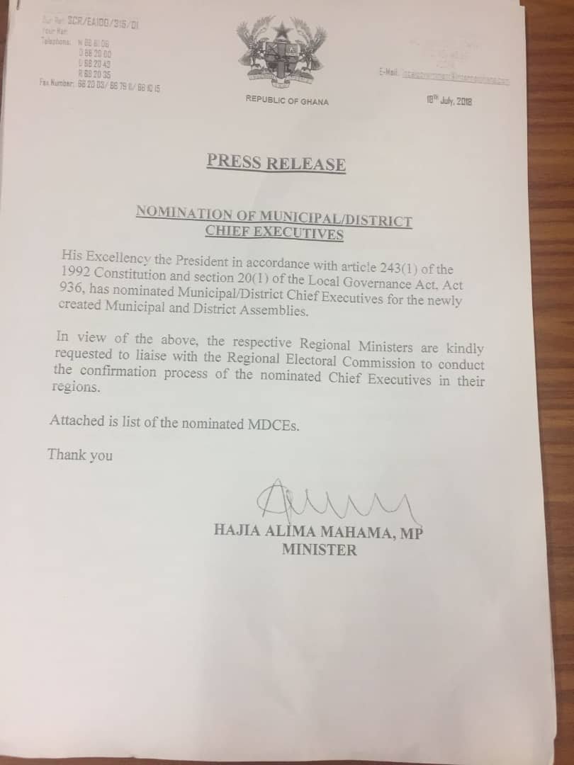 According to the Minister of Local Government, Hajia Halima Mahama “the respective Regional Ministers are kindly requested to liaise with the Regional Electoral Commission to conduct the confirmation process of the nominated Chief Executives in their Regions.”
