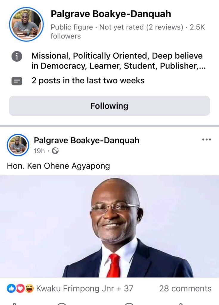 In a surprising turn of events, Dr. Palgrave Boakye-Danquah—former Deputy Director of the Danquah Institute and ex-Government Spokesperson on Governance and Security—has publicly endorsed the candidature of Hon. Kennedy Ohene Agyapong as the party’s next presidential candidate. He made this endorsement through a series of posts on his social media platforms.