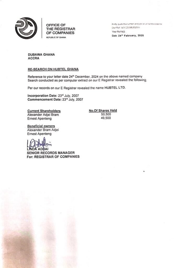The researcher first spoke to Cornelis Rouloph Otoo, the Board Secretary and a member of Hubtel’s legal team. Otoo told DUBAWA that the Vice President has no shares or beneficial ownership in the company.