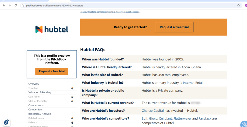 We looked at more public statements and exchanges, such as PitchBook, which listed Chanzo Capital, a venture capital firm headquartered in Atlanta, Georgia, and an investor at Hubtel. Chanzo Capital is well-known for investing in information technology companies in South Africa, Ghana, Nigeria, Ivory Coast, and Kenya.
