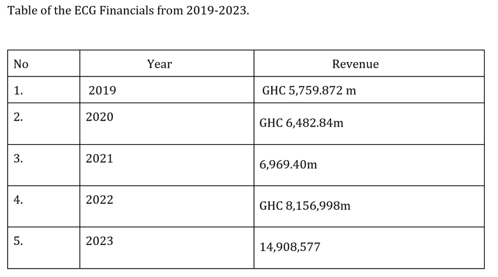 ECG’s sales revenue was GHC 5,759.872 million in 2019, GHC 6,482.84 million in 2020 (pg 29), GHC 6,969.40million in 2021 (pg 45), GHC 8,156,998 in 2022 and GHC 14,908,577 in 2023 (pg 31).