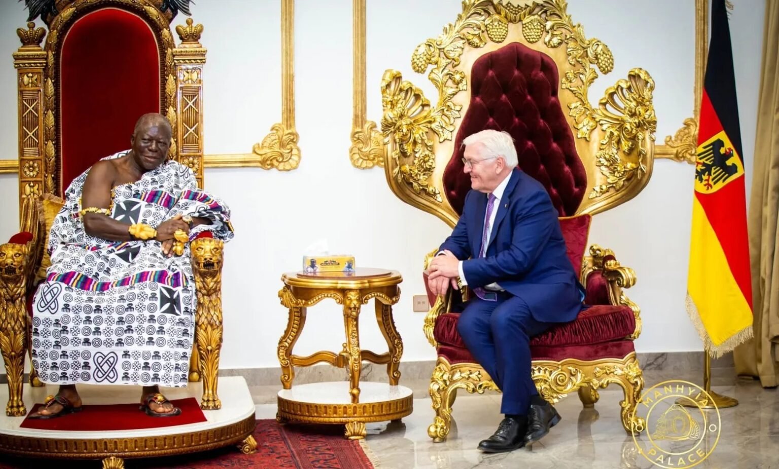 The President of Germany, His Excellency Frank-Walter Steinmeier, experienced a grand display of Asante royalty and culture during a courtesy call on the Asantehene, Otumfuo Osei Tutu II, at the Manhyia Palace in Kumasi as part of his three-day state visit to Ghana.
