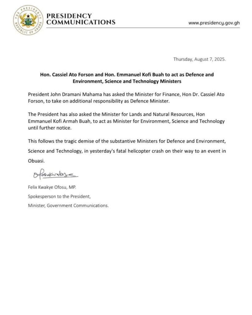Meanwhile, President Mahama has suspended all public engagements and official duties for the rest of the week as the country enters a period of mourning. A three-day national mourning period has been declared, beginning Thursday, August 7, 2025.