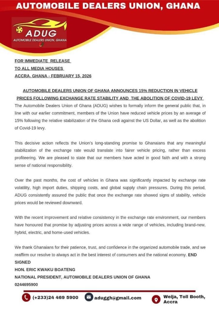 The Automobile Dealers Union, in a statement Sunday, dated February 15, 2026 and signed ADUG National President Eric Kwaku Boateng said the reduction is already being implemented by its members nationwide, covering a broad range of vehicles including brand-new, hybrid, electric and home-used cars.