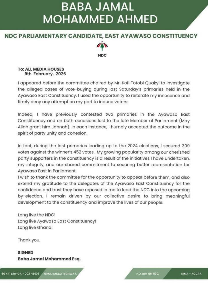 In a statement dated Monday, February 9, 2026, Baba Jamal said he appeared before the committee chaired by Kofi Totobi Quakyi, where he “reiterate[d] my innocence and firmly deny any attempt on my part to induce voters.”