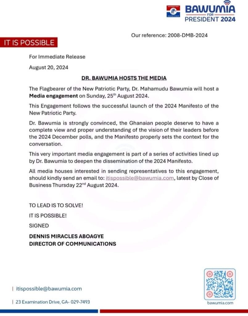 The New Patriotic Party’s (NPP) flag-bearer, Dr. Mahamudu Bawumia, is expected to meet the media on Sunday, August 25, 2024.