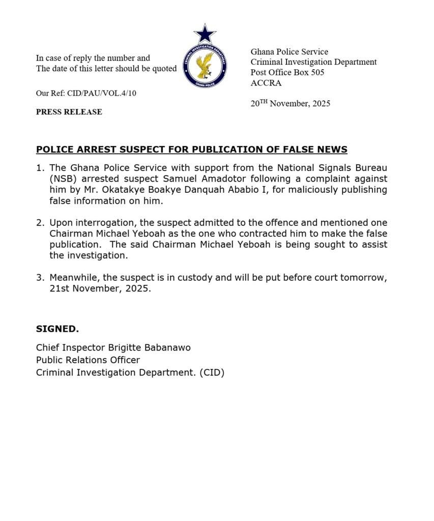 According to the police. during interrogation, the suspect reportedly admitted to the offence and claimed he had been contracted by an individual identified as Chairman Michael Yeboah to publish the false content.