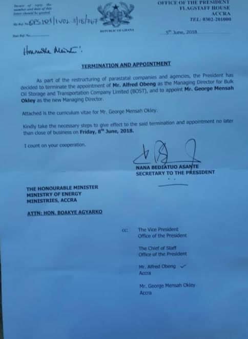 A letter signed by Secretary to the President, Asante Bediatuo said Mr. Obeng’s dismissal is “part of restructuring of Parastatal companies and agencies, the president has decided to terminate the appointment of Mr. Alfred Obeng as the Managing Director of BOST and to appoint Mr. George Mensah Okley as the New MD.”