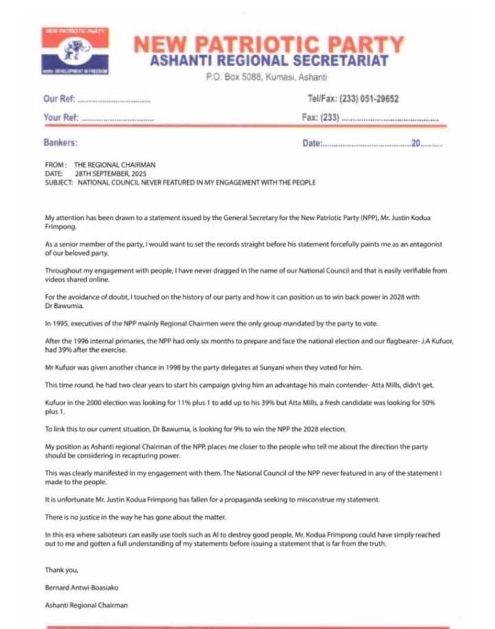 In a statement dated Sunday, September 28, 2025, Chairman Wontumi clarified that his remarks centered on the history of the NPP and strategies for reclaiming power in the 2028 elections, not on the National Council.
