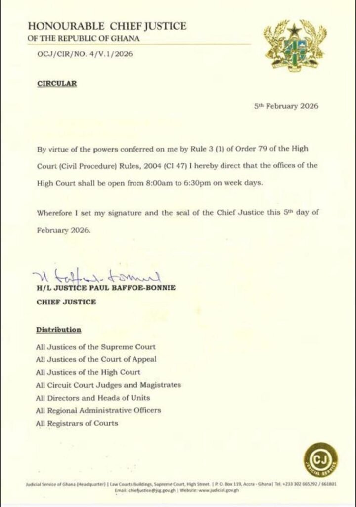 In a circular sighted by Starrfm.com.gh signed by the Chief Justice, dated February 5, 2026, and distributed to all levels of the Courts, including judges, magistrates, heads of departments, and regional administrators, the CJ directs that offices at the High Courts be opened from 8 a.m. to 6:30 p.m. on weekdays.