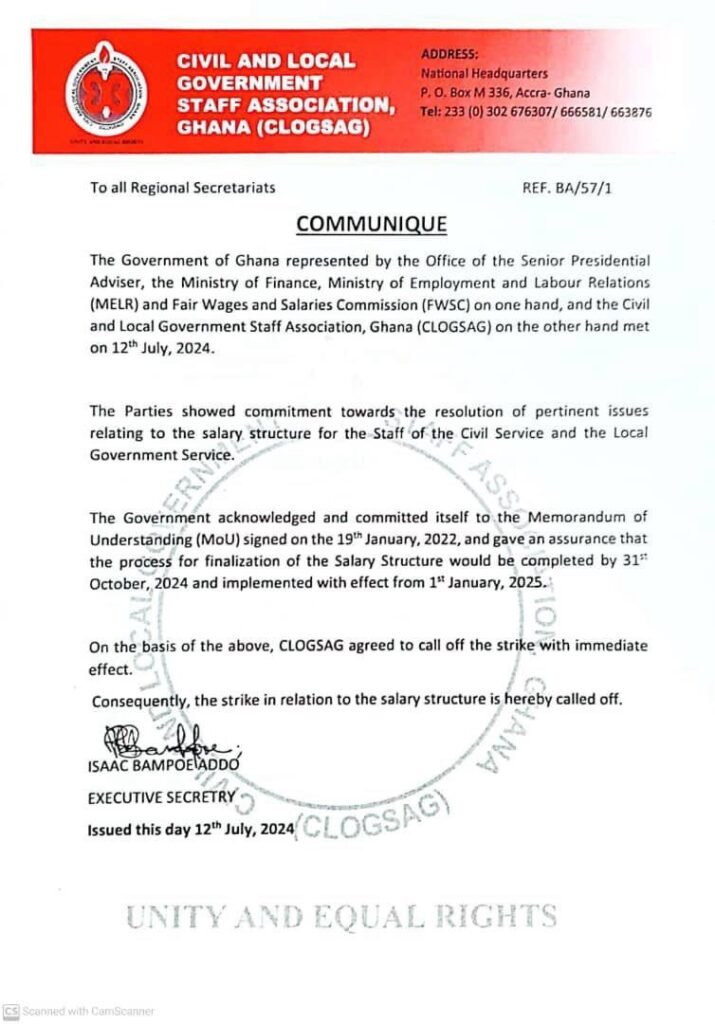 The Civil and Local Government Staff Association, Ghana (CLOGSAG) has called off its strike about salary structure.