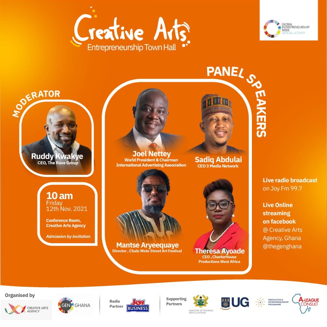 Creative Arts Agency, in collaboration with Global Entrepreneurship Network-Ghana (GEN-Ghana), will host the Creative Art Entrepreneurship Town Hall as one of the activities to commemorate the 13th Global Entrepreneurship Week (GEW) celebrated from 8th -14th Nov. 2021 in over 150 countries including Ghana.