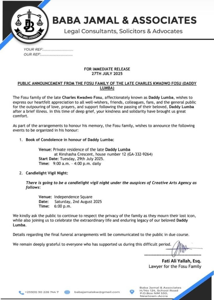 “As part of the arrangements to honour his memory, the Fosu family, wishes to announce the following events to be organized in his honour: Book of Condolence in honour of Daddy Lumba:
