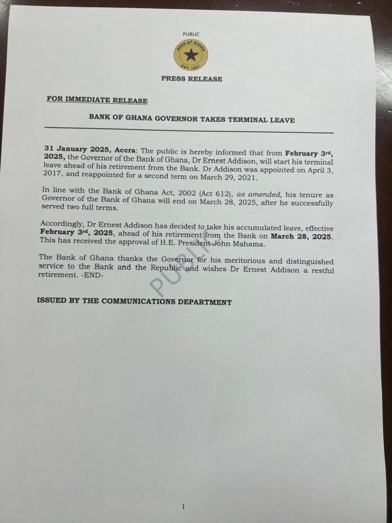 “Accordingly, Dr. Ernest Addison has decided to take his accumulated leave, effective February 3rd, 2025, ahead of his retirement from the Bank on March 28, 2025″, the statement added.