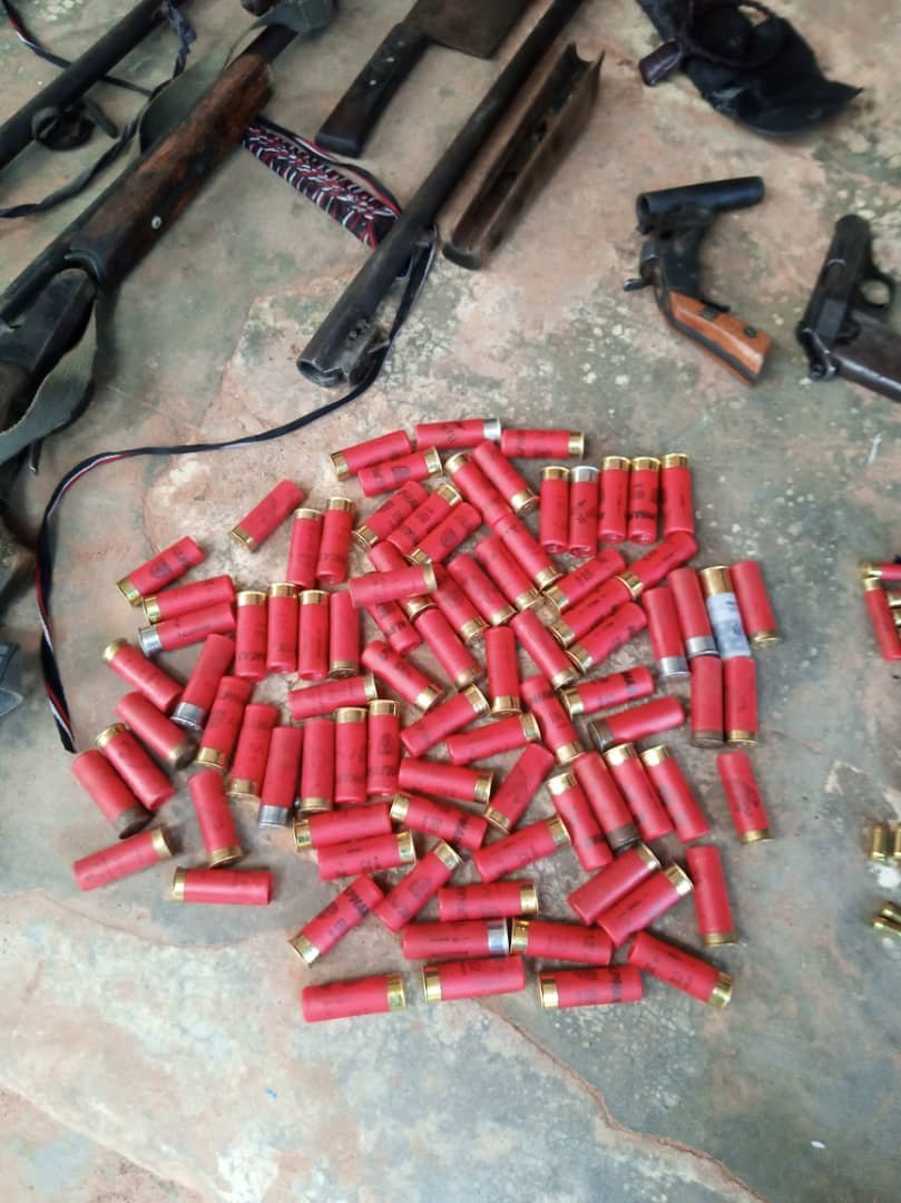 The weapons retrieved are; one foreign pistol, three locally manufactured pistols, four single-barrel shotguns, 66 live AAA and BB cartridges, eleven 410 cartridges, ten 7.65mm ammunition,17 machetes, and two daggers.