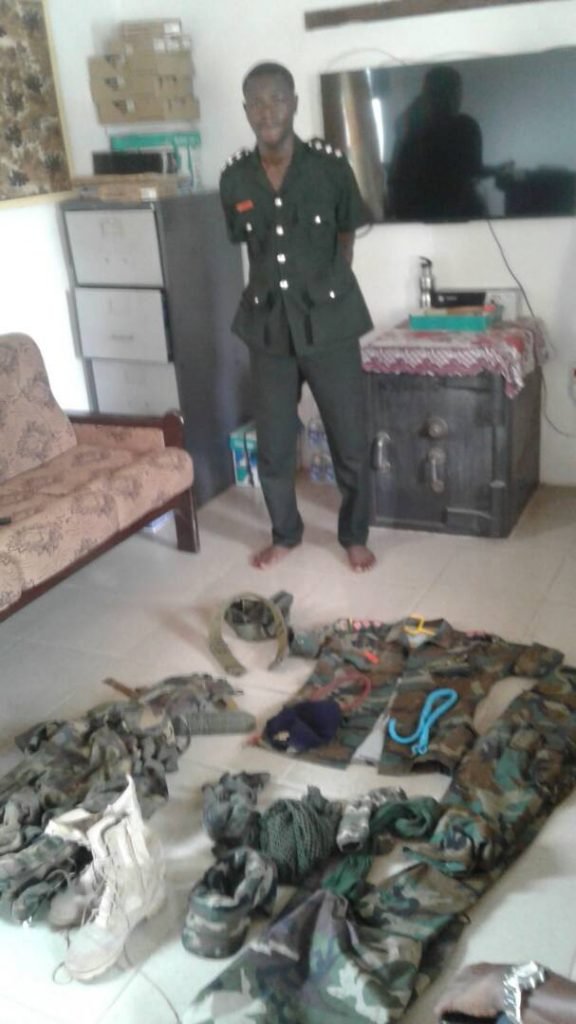 The suspect was arrested on January 28, at about 8:20pm. Subsequent search in his room led to the retrieval of three (3 ) military uniforms, kit Bag, Large Bag, water Pack, Barrette with a military crown, Desert boot and Military belt.