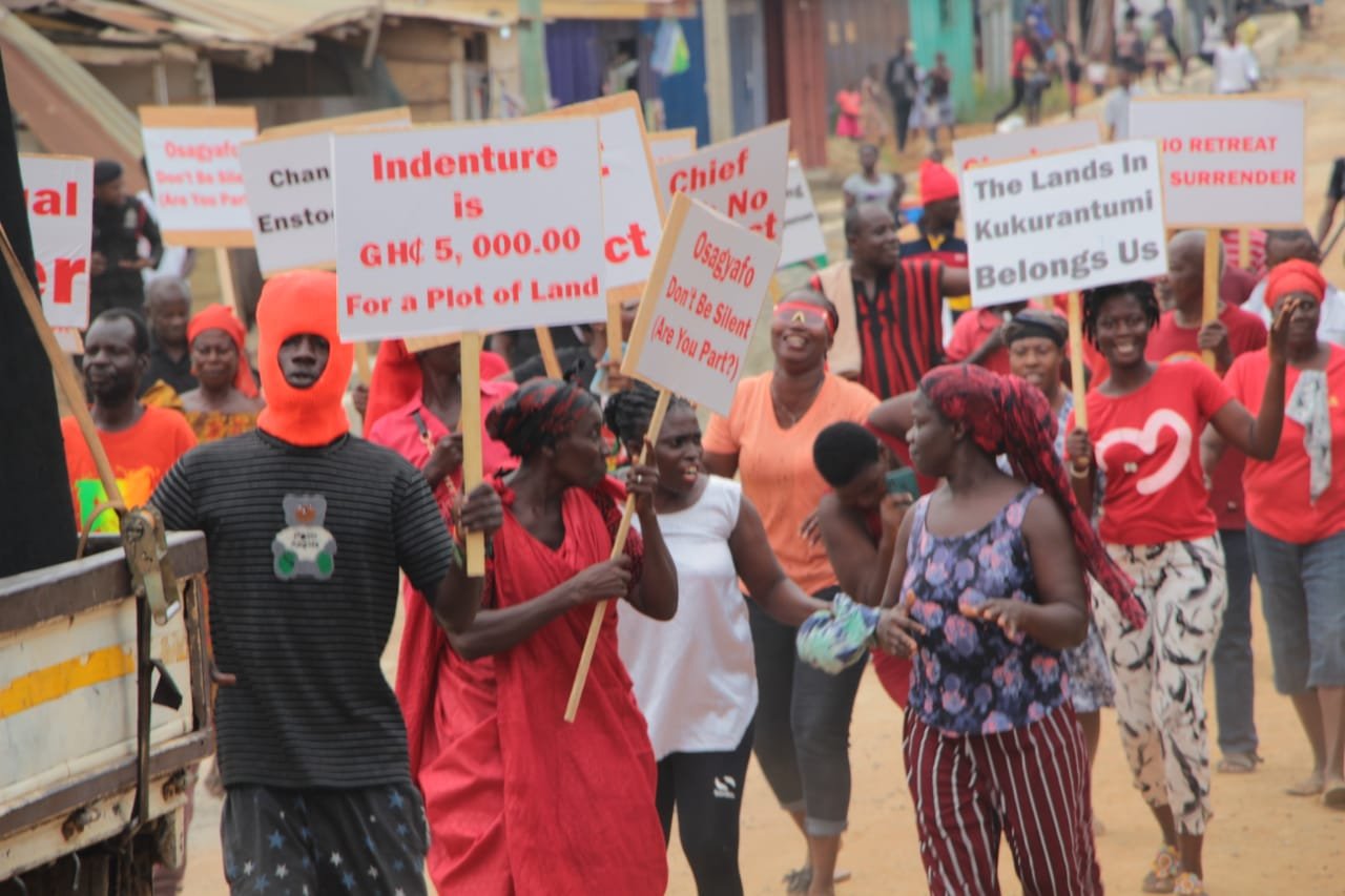 A group calling itself concerned Citizens of Kukurantumi made up of various families and clans in Akyem Kukurantumi in the Eastern region demonstrated Friday, August 19, 2022 against the Chief of the town Daasebre Boamah Darko over indiscriminate and illegal sale of family and individual lands in the town.