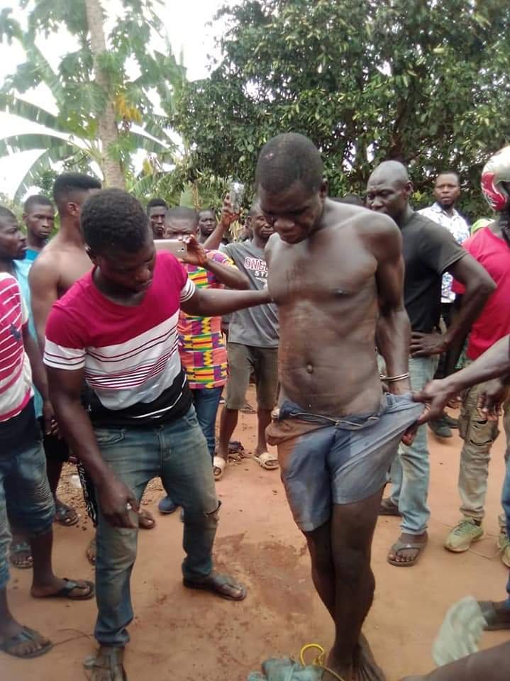 The suspect Kofi Felix believed to be in his 30s was overpowered by angry residents in the community after the gruesome act and was nearly lynched having beaten him to a pulp.