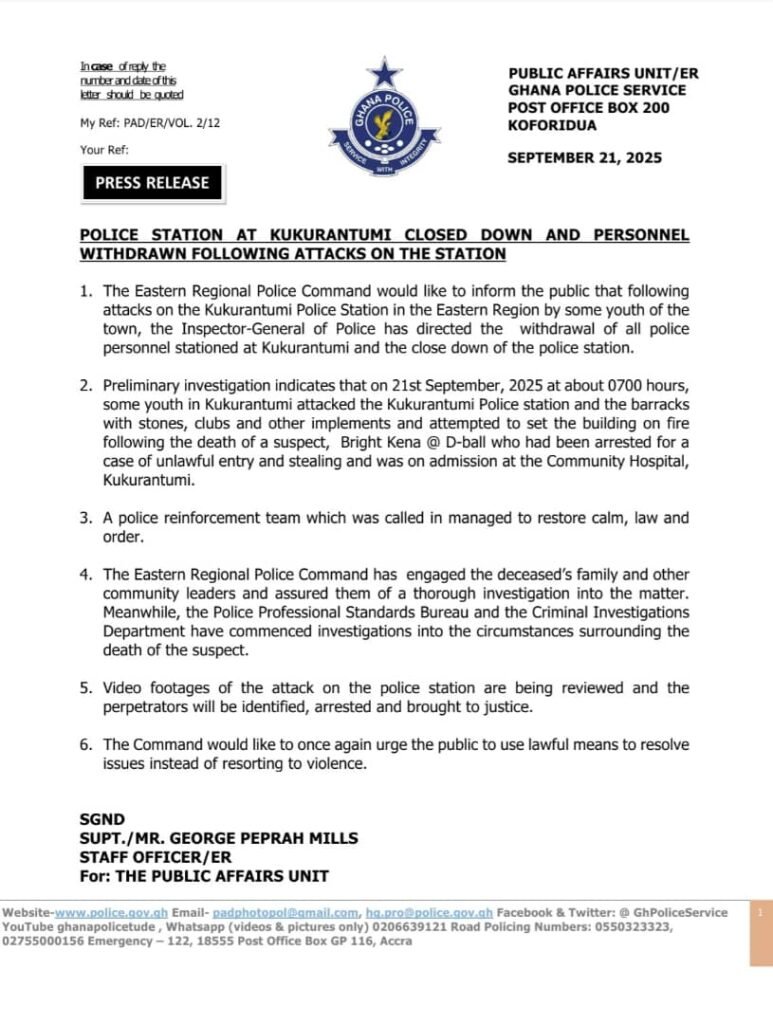 The Ghana Police Service has shut down the Kukurantumi Police Station in the Eastern Region and withdrawn all officers after violent clashes erupted between residents and security personnel on Sunday, September 21, 2025.
