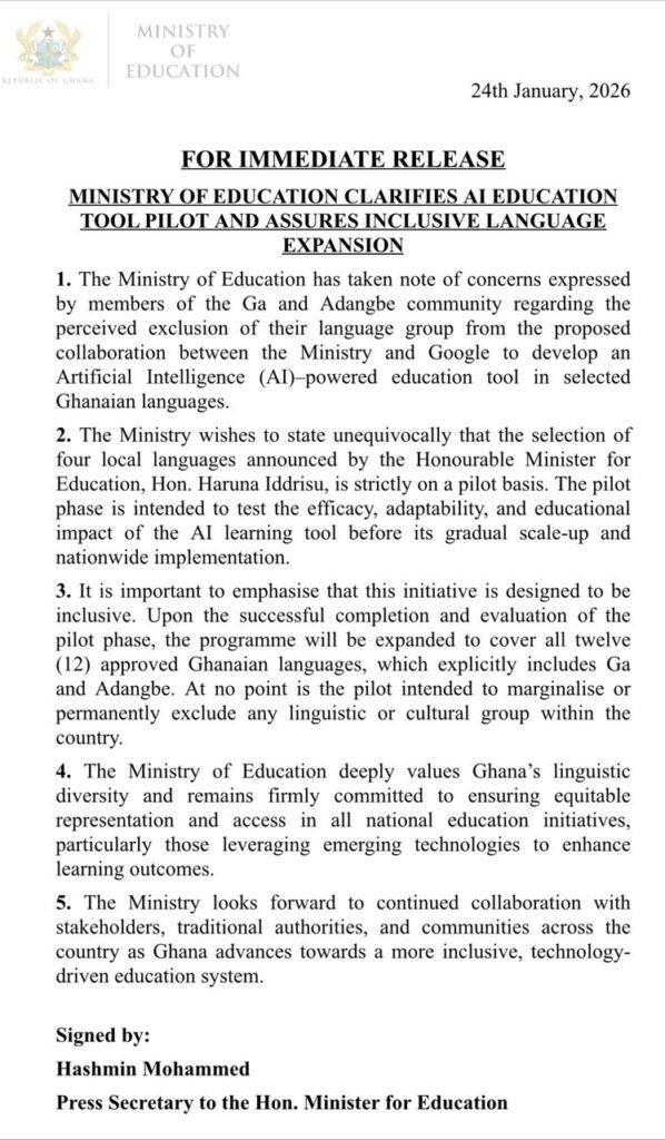 In a statement dated Saturday January 24, 2026, the Ministry addressed concerns raised by members of the Ga and Adangbe communities following the announcement of a planned collaboration with Google to develop the AI learning platform.