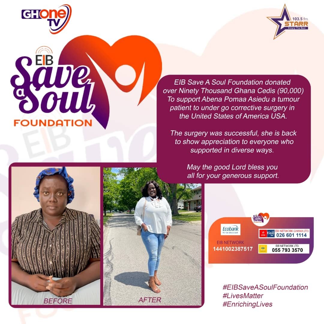 The Ghanaian entrepreneur was able to undergo this surgery through kind courtesy, of donations from the general public through EIB’s Save Soul Foundation. The foundation raised GHS 90, 000 to aid her surgery in America.