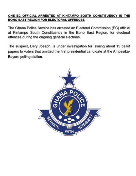 The Ghana Police Service has confirmed the arrest of an Electoral Commission (EC) official in the Kintampo South Constituency of the Bono East Region for alleged electoral offences during the ongoing general elections.