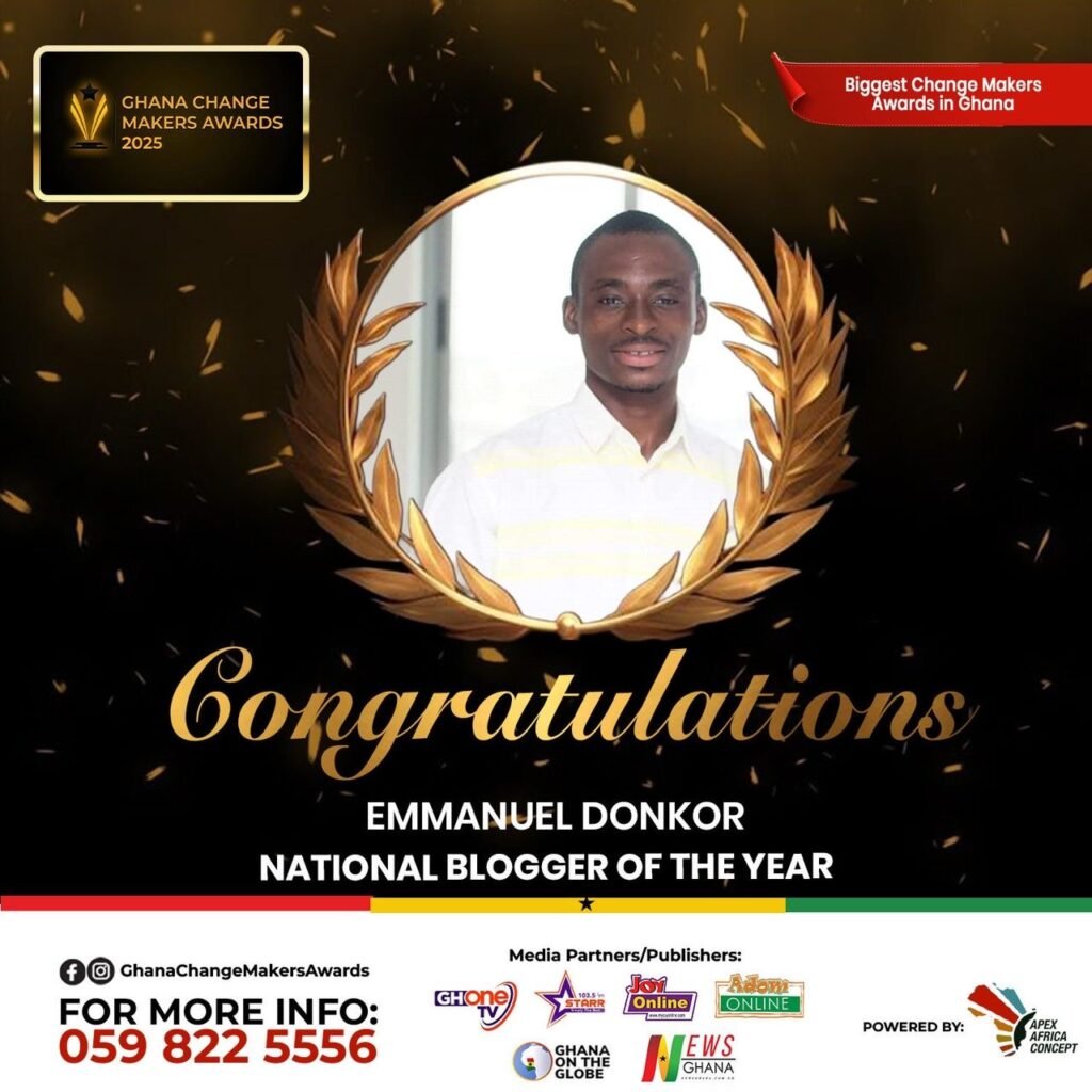 Fast-rising Ghanaian blogger and founder of Donkorsblog.com, Emmanuel Donkor, has been crowned National Blogger of the Year at the Ghana Change Makers Awards, held on November 29 at the CLOGSAG Headquarters in Accra.
