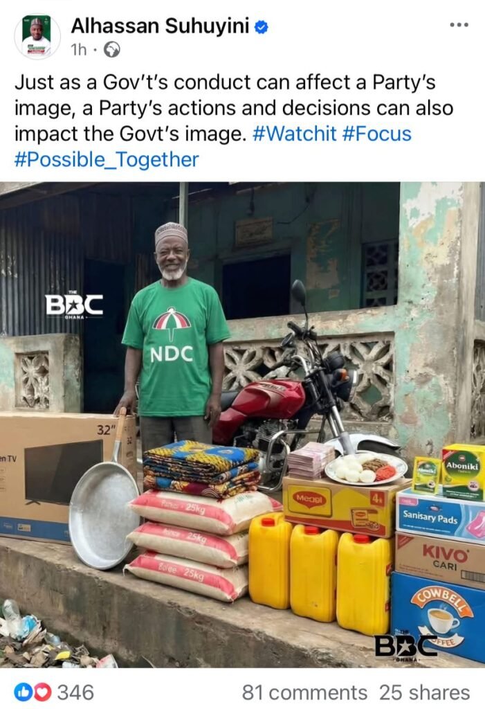 Images circulating on social media and shared by several platforms claim to show a man purported to be a delegate at the Ayawaso East NDC parliamentary primaries, behind bags of rice, a motorbike, gari, cash, eggs, pepper and other items, allegedly distributed as part of vote buying during the election.