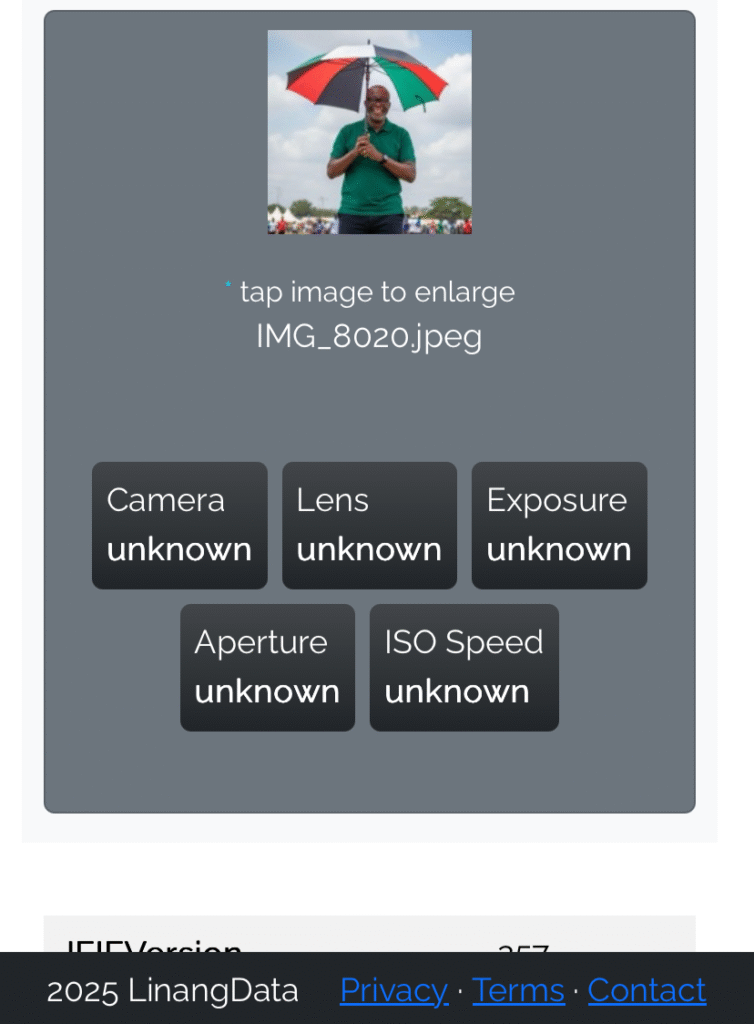 When the image was examined on Linangdata.com, which reads deeper digital traces of images, all the key data fields were marked as “unknown.” The platform could not detect any camera or lens used to capture the image, another indication that the picture was not taken with a real camera.