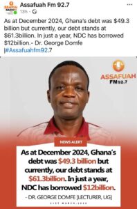 On March 21, 2026, a flyer circulated by Assafuah FM 92.7 reported that Dr George Domfe, a lecturer at the University of Ghana, claimed that the NDC government had borrowed $12 billion within a year.