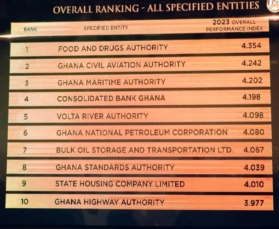 The FDA topped the league with an overall performance index of 4.354 in 2023, followed by the Ghana Civil Aviation Authority, which scored 4.242 and won the Overall State-Owned Enterprise (SOE) of the Year 2023.