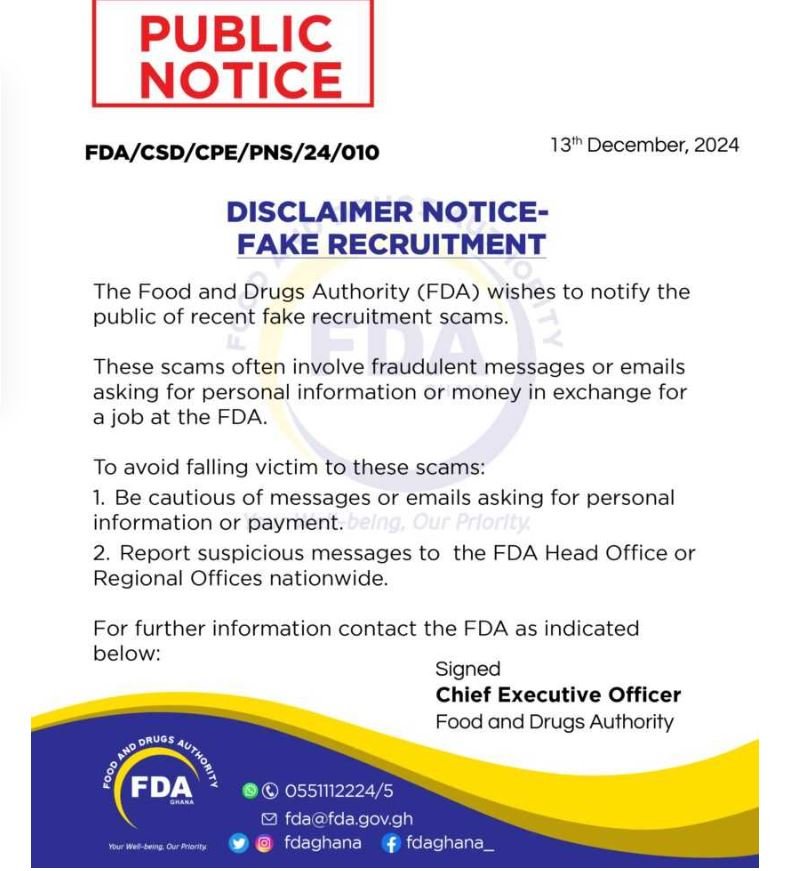 The Food and Drugs Authority (FDA) has warned the public about recent fake recruitment scams targeting job seekers.