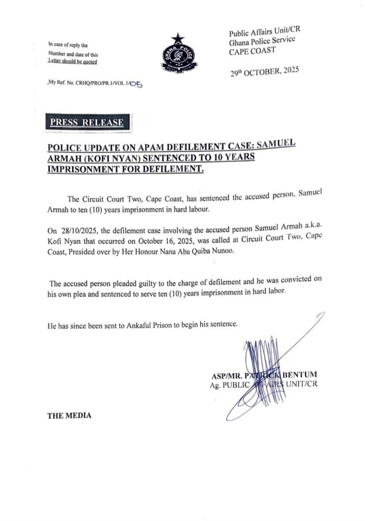 A police statement signed by ASP Patrick Bentum said Her Honour, Nana Aba Quiba Nunoo sentenced Kofi Nyan on October 28, 2025 after he pleaded guilty to the charge of defiling a 13-year-old girl at Mumford.