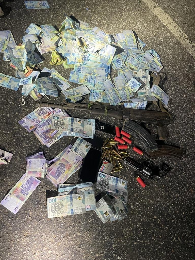The report added: “The car was forced to stop since the occupants were showing resistance. Two of the tyres were subsequently deflated. An instant search conducted in the car in their presence revealed one AK 47 Assault Rifle with Number 12142372 plus two magazines loaded with twenty- four (24) rounds of ammunition, one python Revolver pistol, Eight (8) BB live Cartridges, Nine (9) gold nuggets and cash the sum of Nine thousand and seventy-seven Ghana Cedis. (Ghc 9077.00) (.) The suspects are detained and exhibits including Toyota Land cruiser retained and the vehicle impounded for investigations”.