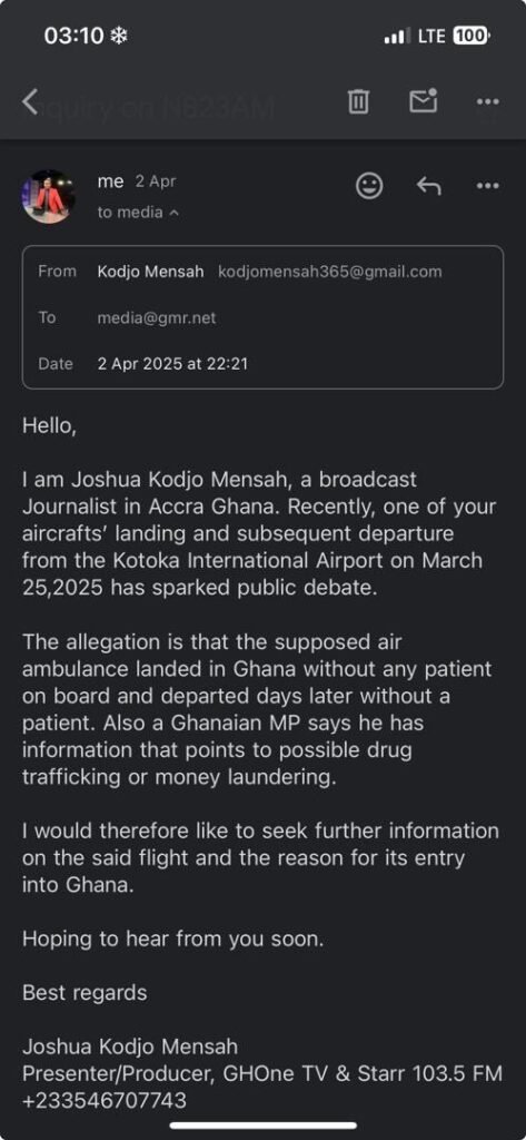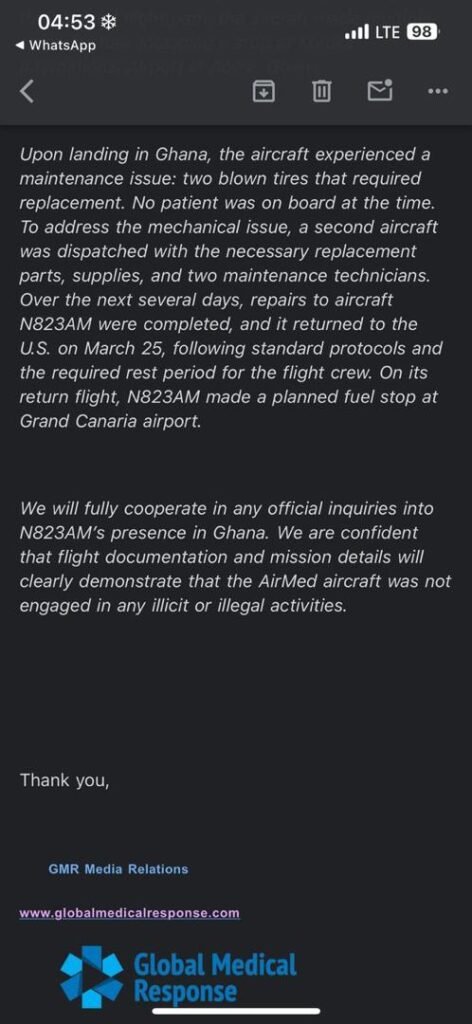 In a response to a mail query by EIB Network’s Joshua Kodjo Mensah, the U.S.-based air ambulance company categorically denied any wrongdoing, emphasizing that the aircraft’s stop in Ghana was a routine technical layover—not part of any covert operation.