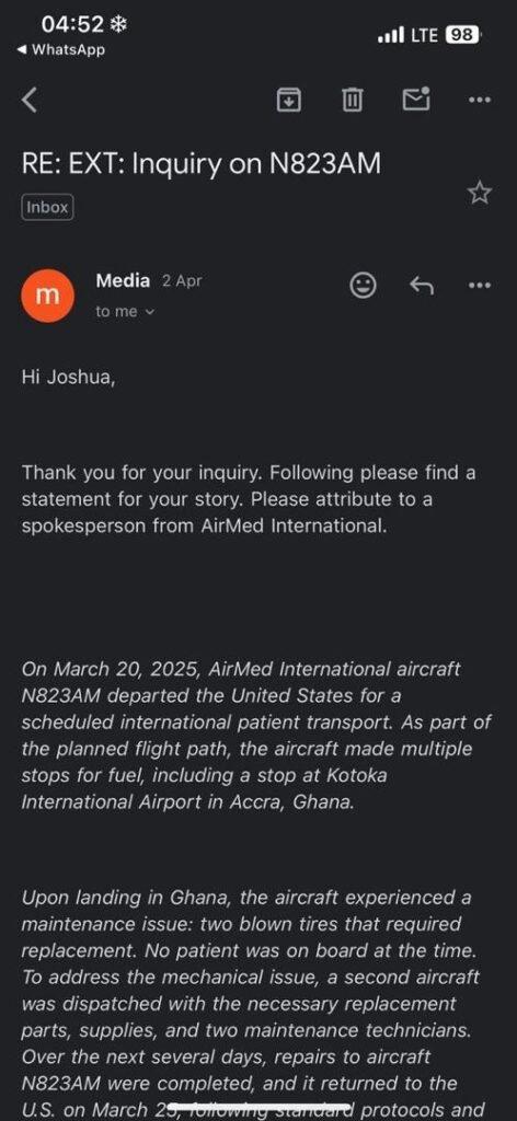 “On March 20, 2025, AirMed International aircraft N823AM departed the United States for a scheduled international patient transport. As part of the planned flight path, the aircraft made multiple stops for fuel, including a stop at Kotoka International Airport in Accra, Ghana,” the mail reads.