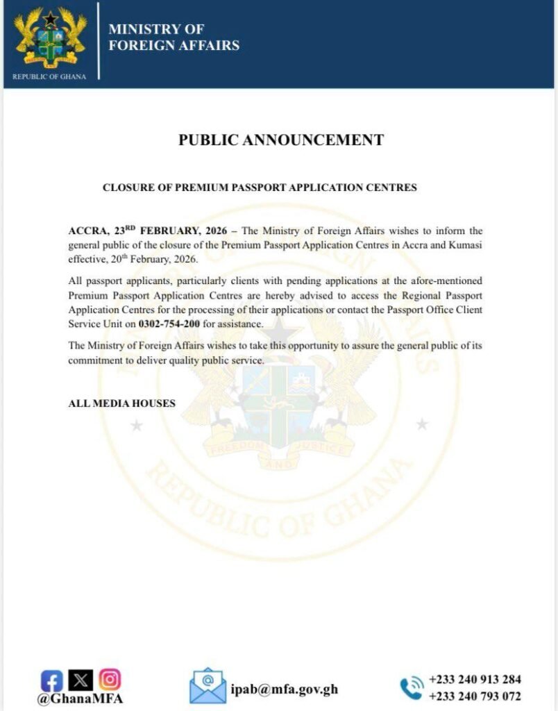 The Ministry of Foreign Affairs has announced the closure of the Premium Passport Application Centres in Accra and Kumasi, effective February 20, 2026.