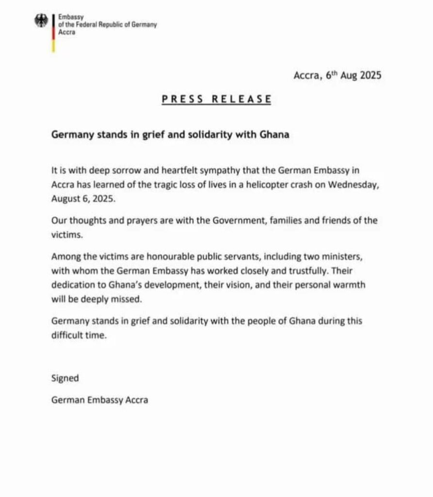 The German Embassy in Accra has expressed deep sorrow and solidarity with Ghana following the tragic military helicopter crash on Wednesday, August 6, 2025, that claimed eight lives, including two cabinet ministers.