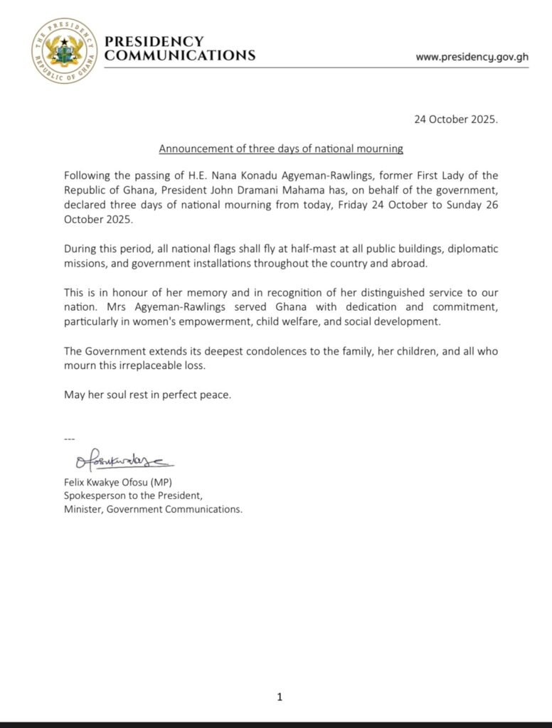 A statement signed by the Minister for Government Communications and Presidential Spokesperson, Felix Kwakye Ofosu, announced that the period of mourning will run from Friday, October 24 to Sunday, October 26, 2025.