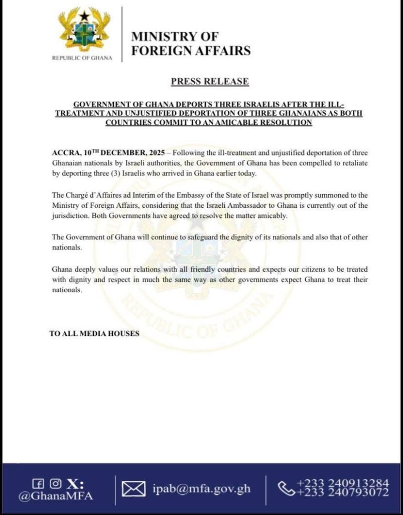 Ghana has deported three Israeli nationals in response to what it describes as the ill-treatment and unjustified deportation of three Ghanaians by Israeli authorities, the Ministry of Foreign Affairs has announced.
