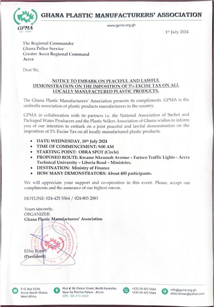 The Ghana Plastic Manufacturers Association is expected to embark on a demonstration on Wednesday, July 10, 2024.