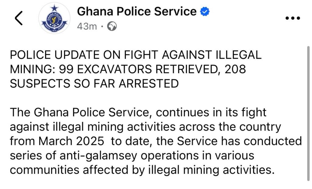 The Ghana Police Service has intensified its nationwide crackdown on illegal mining activities, popularly known as galamsey, with a total of 208 suspects arrested and 99 excavators retrieved since March 2025.
