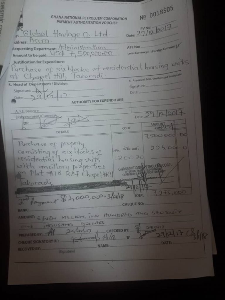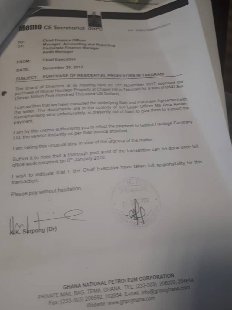 A memo signed by the Chief Executive Officer of GNPC, Dr. K.K Sarpong directed the Chief Finance Officer to make the payment to Global Haulage Company Limited – owners of the property – without delay.