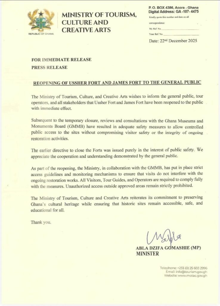 The Ministry of Tourism, Culture, and Creative Arts has announced the immediate reopening of Ussher Fort and James Fort in Accra, following a temporary closure for safety reasons.